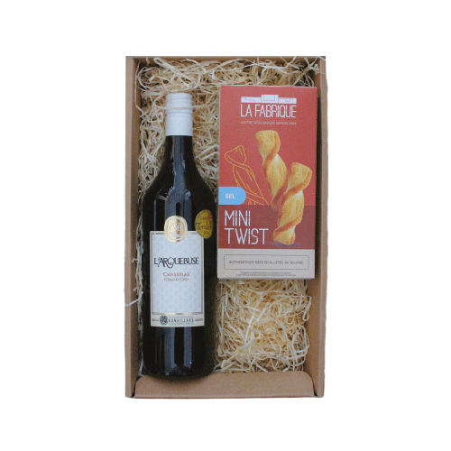 Unser Coffret Dégustation besteht aus einer 75-cl-Flasche unserer Arquebuse (Jahrgang 2024) sowie 100 g Salz-Mini-Twists „La Fabrique“.